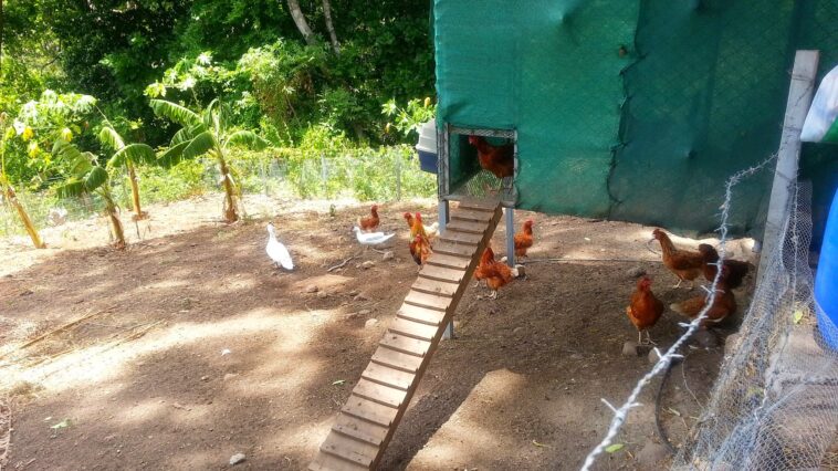 4. Install Perches and let birds to stay off the floor – particularly as they roost at night. Normally 8 inches of roost space per bird is recommended. We used large branches from the jungle and they’ve lasted over a year now.